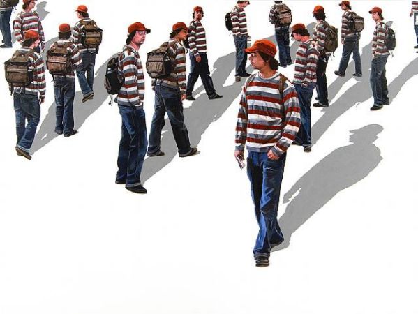 | Carol K. Brown, Pedestrian (63020), 2006 The people depicted in these paintings have become characters in an imaginary play. Against a stark white background, the intensely colored figures are replicated and arranged in groups according to Brown�s �manipulation�, thus creating relationships that never existed, but appear plausible, nonetheless. The artist explains: �As I wander streets I am often amazed at the delicious array of visuals amongst the �prosaic.� The angle of the observed and the observer is constantly shifting. By segregating, duplicating and changing scale of my subject, I am setting up hypothetical relationships, both physical and psychological. My anonymous subjects lie squarely within the realm of the public, but in their isolation, underscored by the intense shadows and ambiguous spaces, they give off very personal, private vibrations.�
