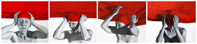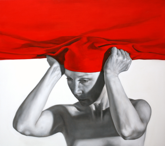 On close inspection ARINA’s handling of paint is not of bold gestures but the quiet, slow build-up of tonal values which beautifully suggest the sensual surface of the skin and underlying bone structure. The lack of hair accentuates the features of the face with the folds of the head scarf contributing to the architecture of the head, creating an almost sculptural object. The repetition and slight variation of the compositions suggest film or photographic sequences and the flat red head scarf creates a colour-field that generates an interesting shifting pictorial space for the face to occupy. ARINA uses herself as a vessel for her ideas; however, I would argue the paintings are not self-portraits. The likeness is striking and her expressions are beguiling; she occupies her face with the confidence of an actor trying to communicate to a broad audience.