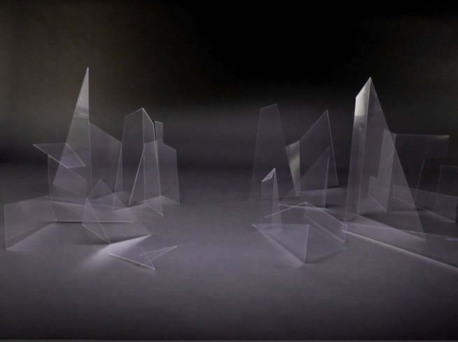 While creating surface patterns, Sarcevic is also happy to find them. Consider Working Surfaces (2004), a found object consisting of two black granite slabs that the artist purchased from a mine near the Mediterranean resort town of Cap d�Agde. Covered with a maze of lines and circles, the slabs are the miners� variation of the butcher�s block � used over the years for cutting other pieces of granite destined for construction. When Sarcevic moves beyond the found surface to create a fully autonomous structure, he tends to evoke architecture without ever building it. Replace the Irreplaceable (2006) � a three-dimensional �J� form made with solid layers of pearwood and brass that fan out like a massive pair of bellows � reverses the traditional hierarchy, in which architecture is the fundamental foundation and ornament is an added afterthought. The hook of the �J� is wide and tall enough to accommodate an adult, yet the piece is so finely crafted that any architectural use appears secondary, if not superfluous. Why bother adding a roof and more walls to make a shelter? Other works combine created and found patterns. �Untitled� (2006) � a series of sculptures made from delicate bars of brass joined together � is adorned with geometrically patterned silk scarves that the artist picked up at a Berlin flea market. In photographs the bars look like the lines of so many connected thoroughfares extracted from a city map; the scarves, folded around the bars, demonstrate that these works are actually three-dimensional forms, both protruding from the wall and using the wall as a floor support.