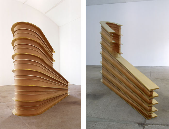 Sarcevic�s most recent solo exhibition at the Hamburger Kunsthalle features his series of films �Only After Dark� (2007), in which the artist has basically made moving pictures out of still sculptural forms: paper, stones, a slab of steak, a tree branch. �I see these pieces as actors�, says Sarcevic, who wanted to create the possibility of an almost social rapport between them. Of course, sculptures are not action figures, let alone actors with speaking parts; the movement comes only through the camera � changing frames, new perspectives, zooms in and out � as well as through the instrumental music score, which seems inspired by the more meditative manifestations of experimental jazz from the 1970s. While reducing the sculptures from three dimensions to two, the films lend them an illuminated texture as well as the depth of projected images. �But the films are not stories about these objects�, says Sarcevic. While forcing viewers to perceive the sculptures through the perspective of his camera lens, the artist gives viewers another sculptural experience by building a custom-made screening-projection room for each film. Each one gets a kind of mobile home for its travels, though Sarcevic calls them �pavilions�. In contrast to most projections � including his own early ones � �Only After Dark� comprises both films and mini-cinemas. Everything � the walls and the ceilings, the churning reels of the projector and the moving images glowing on the wall � becomes a surface.