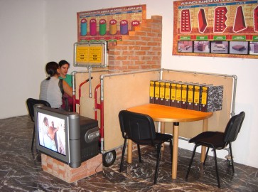 | to popular engineering, specially those structures built by street peddlers for the display of their merchandise, the model Palacios uses for the construction of his mural wheelbarow and his shelves. This interplay of audiovisual technology and popular solutions produces a kind of eclectic atmosphere. Based on the union of heterogeneous elements, ‘Zona de distension…’ is grounded in an experience of symbolic exchange that transcends disciplinary fragmentation and promotes the collaboration between distinct forms of human activity. Author: Felix Suazo | |||||||