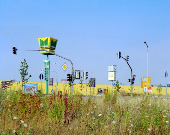 | Galerie La Ferronnerie presents édith roux : euroland/undescape, photographies, multimedia – 3 Mar to 9 Apr 2005 Edith Roux (born in Paris, 1963) analyses with photography contemporary landscapes in what they reveal on the evolution of urbanization and our environment. EUROLAND* – Indefinite zones with no particular qualities are created between cities and the surrounding countryside. Scenery consists of shopping centres built along motorways, dual-carriageways, ring roads and intersections; of roads lined with billboards; and of soulless, all-purpose buildings. | ||||
