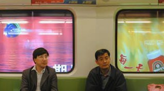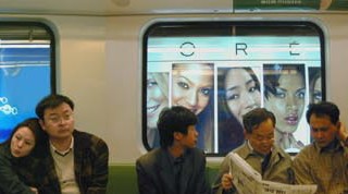In this era of globalisation, I felt that it was important to look at suburbia and consider it on a European scale. Given that the urban planning of these areas is usually a consequence of economic, financial or fiscal pressure, there is now a tendency towards homogenisation throughout Europe. This series of photos represents 3 years work on the outskirts of more than 15 major cities within the European Union. With the concern for detail of documentary photography and taken using a large format camera, they present a personal view of these border zones. Will the green wastelands in the foreground, of no economic value, take over the suburban architecture of the background or will the opposite occur? The pictures of these zones of friction are a result of questions like this. Flattened by the lack of lines of perspective, no roads or tracks invite the viewer into the scene. The same computer-generated, cloudless sky serves to eliminate any reference to space or time and only a few signs offer any indication of linguistic or cultural variations. Euroland series : 34 photographs, lambda print/aluminium 100x120cm, edition of 5. | Available during the show : Book Euroland , Editions Sujet/Objet, with texts by Gilles Clément and Guy Tortosa. With the Underscape series, Edith Roux describes again the advertising landscape influence on dayly life. She realised this work inside Shanghaï underground (2003). Behind travellers’s faces, one can observe large standard adverts, the photographic scenary reminding the 2 parts disposition of euroland pictures. Four series of photos are shown on flat tv screens fixed on the wall. With the press of a button, the film stops randomly on passengers images. This work consists of 4 interactive DVD. Edith Roux has also made the work DREAMSCAPE, consisting of a series of 32 photos printed on a 2600cmx60cm canvas, representing new buildings in Shanghaï and idealised landscapes. – A book ‘Dreamscape’ is also available, with texts by Paul Ardenne.