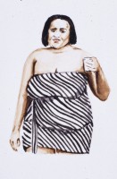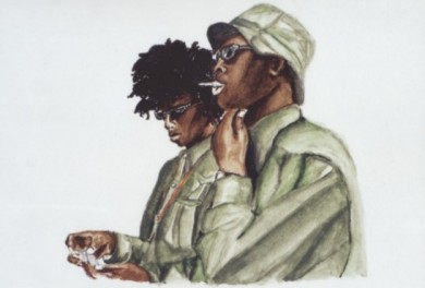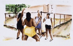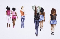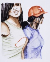 ‘The subjects of these new paintings are drawn from urban youth, hip-hop culture. As the title suggests, it is the complex constructions of attitude and bravado in the subjects that provide the dynamic for this show. They are not synonymous with the ‘bling-bling’ stereotypes portrayed in mass media, but are young boys and girls who aspire to the ‘ Crystal quaffing’ antics of their idols. The small watercolour paintings are mainly based on photographs taken over the summer of 2003, at various carnivals and parties, although some are from magazines and television. While these figures may at times seem tentatively familiar, they are anonymous and all sources remain non specific. The glamour of these subjects is challenged by the fake labels on their clothes and the neutral background; but the paint itself, applied in disjointed patches of colour, also function to unsettle any presumed trajectory between the youth centre and MTV. Instead a welling-up of blind hope is tangible manifest as the paintings modestly coalesce around the form of a rude-boy or girl in their creative moment.’