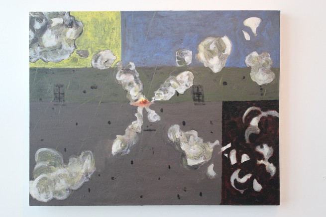 Random objects are stuffed in dark, dusty cupboards; dirty canvases are propped up and held together with sticks and bits and bobs; faded bunting celebrates a long forgotten event and smoggy clouds are belched out across industrial landscapes from Teesside to South Wales to the American Mid West.
