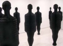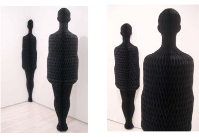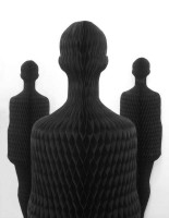 ‘Tissue’ was an installation in the Nohra Haime Gallery, NYC, of 14 life-size, handmade figures made out of black tissue paper and glue. The forms are reminiscent of tissue-paper party decorations gone seriously awry. Each figure measures 64 in x 15 in x approximately 15 in, echoing the silhouette of the artist's body. A majority of the figures are hung from the ceiling, while others are attached to the walls and folded into corners. The viewer is allowed towander amongst these three-dimensional shadows, the air currents created gently turn the hanging figures. The audience is confronted with exactly the same profile from all vantage points. Their omnipresence is both fixed and dynamic.