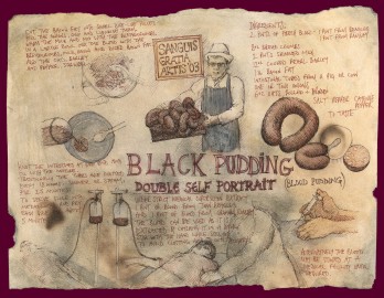 Left image -BLACK PUDDING – DOUBLE SELF PORTRAIT.Ink and metalpoint on paper, 26cm x 18cm, 2003, for the VENICE BIENNALE AS PART OF THE FIRST SCOTTISH PRESENCE, 'ZENOMAP' AND PRODUCED A POSTER FEATURING A RANGE OF UNREALISED DREAMS DRAWN IN THE STYLE OF LEONARDO DA VINCI