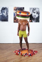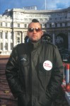 Top right image – Dead of Night. Shown at Gasworks, London, April 2003 and The Collective Gallery, Edinburgh, June 2003. Middle image, Happy Days 2001. C-type Print.Bottom right image, We Are The People – Suck On This 1999-2000.Shown at the I.C.A. Gallery, London.November 5th 1999.Video and photographs with a signed petition entitled…… We Are The People A manically grinning Travis Bickle (Taxi Driver) lookalike stalks the streets of central London searching for suitable prey. His mohican is a crudely self inflicted affair………. He pops pill after pill……..He circles around Downing Street and Buckingham Palace……..He gains access to Downing Street and hands in a petition addressed to Tony Blair………The police lead him away……….We Are The People – Suck On This.