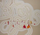 Detiger’s hallucinatory backgrounds and flush color palette create an amorphous visual setting for the subtle interactions of his figures, firmly setting his happy tone. This jocular environment simultaneously references the frenetic and chaotic nature of our media obsessed culture, which bombards us with empty imagery. In Detiger’s hands this portentous obsession is transformed to contentment just shy of complicity. We are aware of our vain foibles and yet not asked to give them the full weight of guilt but to put them in their rightful, playful place. Detiger’s paintings rather than scathing indictments are lyrical musings on the pop shallowness of advertising culture, allowing us to bask in the colorful vapidity of an idealized world of comfort yet dispensing with the naivete.