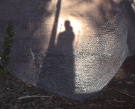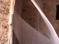 | Veils and the wire mesh changed throughout the day with warm or cool light, transparency and shadows. The sound of birds, cicadas and wind were part of the work. High on the slope a very large tank became "The Bunker", covered with white veils, ricin and wild plants growing inside. The veils as sails on open seas, whistled and flapped with fierce wind. With a golden glow, the veils tamed this threatening tank. Through veils. access to the studio, played on visibility. |