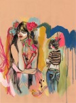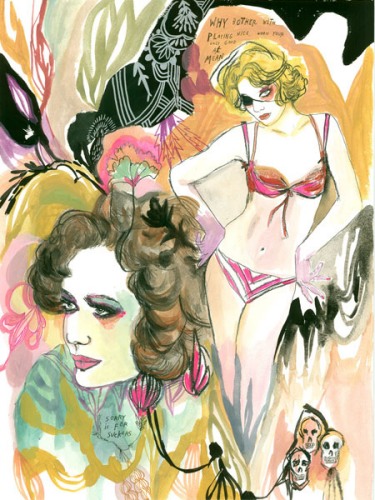 | Invested in a vocabulary of desire, nature, witchcraft and superstition, Buzzelli's paintings are essentially dark love poems inhabited by wicked women, wild animals, secret societies, and places of wonder and fear. With a fascination with the lives of others, Buzzelli's narrative vignettes both obscure and reveal. Inserting brief poetic text into the compositions, Buzzelli creates juxtapositions which cloud an immediate reading of the work; it is unclear if the words serve as the thoughts of her subjects, or an omniscient proposition. These bits become suggestions or clues to the fictive lives of her subjects which the viewer is left to unravel. Above Left: You Can Have What You Want, But You Still Can't Have Me, 2007 Watercolor, Ink, China Marker, Acrylic on Paper 20" x 24" Above right: You Have Nothing, 2007 Watercolor, Ink, China Marker, Acrylic on Paper 20" x 24" Left: Sorry is for Suckers, 2007 Watercolor, Ink, China Marker, Acrylic on Paper 20" x 24" | |||||||