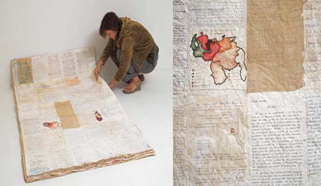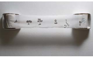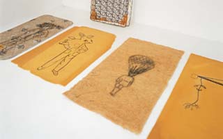 A mattress made out of all the pages of the artist's school notebooks: class notes, homework, drawings, maps, they all cover the pages that have been meticulously and obsessively detached from the notebooks to be reassembled later into bigger pages- of the dimensions of a single mattress- and glued together until getting the right thickness. The school years have become a bed, another Freudian reference, maybe the couch where we lie down to talk to the analyst about our dreams.The painting titled Ms Lumpuy resumes the anguish of castration and repression but in words of the artist through “pure esthetic joy”. The other piece titled Trial and Error is a drawing in a kind of “canvas” made out of the pages of an art history high school book.There, on the pages of Candido Millan's “Universal Art History” we find a drawn image of a monkey stepping into some cardboard boxes, standing up to catch some bananas. Another come back to childhood, but now more primitive, that of the human specie. Maybe also homage to Stanley Kubrick and the famous scene on 2001 Space Odyssey? | What my Father Paid Me is one of the sharpest pieces in the show: a series of bills of a restaurant of a Club in Caracas, glued together to form a big piece of pastel color paper in which we can read the consumption of food and beverages in this restaurant paid by her father. On the paper we see a drawing of an incomplete dollhouse – in which the inexistent ceiling also reveals the presence as a phantom member-, recurrent figure in her drawings. As the “School Bed” this piece takes us to a very personal and autobiographical situation.As with the drawn Roll of Toilet Paper the hybridism and fragmentation as characteristics of a depersonalization of culture are fundamental aspects of the work of the artist. The different “languages” and narratives of the history of art coexist and escape from any intent of classification.Taken from Julieta Gonzales Text La Sra Lumpuy o la Moral del Juguete published by the Museo Alejandro Otero