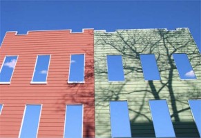 Much of my work is concerned with environmental perception, whether that environment be a physical structure or as abstract as a psychological impression. On this webpage there are images from two bodies of work. The portraits of my neighbor's houses in front of picture-perfect postcard skies make me think about the fluidity of the meaning of home, and how lithe the shifts in our perception of an environment can be. The first set of images is from the series, Light Installations, which are trompe l�oeil paintings that appear to be light and shadow cast on a wall and/or wooden floor from a nearby window. Often the images are in rooms where there is little or no natural light, nor corresponding windows. The efficacy of a window relies entirely on the viewer�s conception of an aperture that will explicate the image--a window, door or possibly a skylight. The conceptual intervention, an aperture, constructed by the viewer lasts only for the period of time they are convinced that what is seen is thrown light and cast shadow, rather than a painting on a wall. While considering the illusion, viewers question reality and their experience of a particular place is radically altered, according to their own specifications.