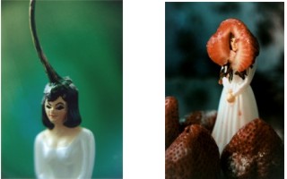Interchangeable Disturbance (ID) consists of 50 color photographs centered on desires and fantasies of a wedding cake figurine. Her magical transforming energy seems to come from her dissatisfaction with her identity as a determined object. This murky scenario suggests phenomena which shifting surface identity produces an ambivalent presence. While she is simulating magical effects on her surface, she is gradually trapped between reality and ideality. As a result, a mixture of pleasure and disturbance comes to her at the same time. Her never-ending exploration into her identity adds more and more personas to her surface, yet, ironically, her new personas persistently keep her on the wedding cake.