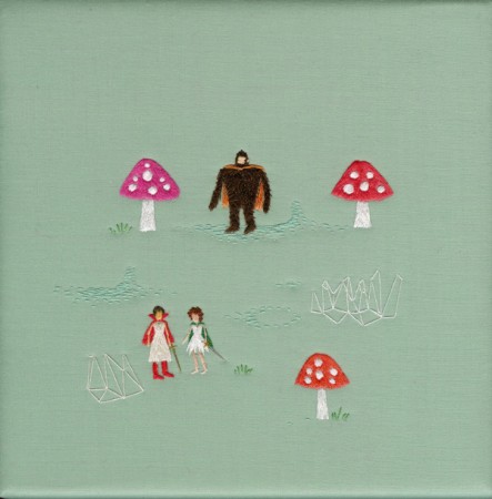 | Sixtyseven is proud to present "Forest Logic",2 Apr to 7 May 2005 a solo exhibition of Los Angeles based artist Megan Whitmarsh. Whitmarshs work primarily consists of embroidered depictions of Yetis, Elves and various pop icons. These characters are sewn in numerous arrangements over monochromatic stretched fabrics. Scenes include socializing Yetis, people from the future chased by geometric shapes, or Elf-girls chatting on cell phones. For her first show with Sixtyseven Whitmarsh presents her most recent embroideries, a series of drawings and a video entitled �The Life of a Yeti�. | ||||