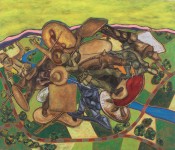 | | | My work includes drawings, paintings and sculpture involving, in one way or another, plastic figures within the landscape. These figures or clusters of figures are part of imaginary � gamescapes,� where the characters are incorporated into a game environment where all can be subject to chance, luck, and competition. The idea that the hero representations of the Western World can and are produced by the millions with cheap plastic, most likely in China or Taiwan, is something I find quite fascinating. |