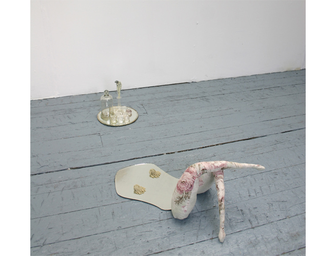 These hybrids appear as both props of domesticity and as human form, in particular the female form. I am interested in juxtapositioning the desirable and the sexualized with the familiar everyday. Placing these elements together allows the viewer to peer pleasurably as they are surrounded by the familiar, yet at the same time they are unsettled. In some of the works, by seeing their own and others reflections peering back at them. In others the viewer has to bend down to see the work putting themselves in a vulnerable position and in others they are confronted by a self mocking humour in the work.
