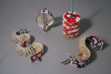 3. - �He spent hours walking��, matches, ink on paper, 38 x 40 in, 2004. CIA diary text: He spent hours walking, the best way to identify the enemy. If you walked long enough, it became clear who was following you. 4. - �cold/war/baby #6�, matches, ink, paper, bolt, 6 x 12 x 20 in, 2004. 5. - �cold/war/baby #2,3,4,5�, matches, ink, rolled paper on locks and bolts, 6 - 14 in, 2004. 6. - �Nabokov's Matches #1,2,3,4�, matches, graphite on paper, 8 x 8 in. ea, 2003 .