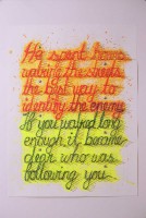 In drawings comprised primarily of ink text and matches �splinter phrases� from my father�s cold war memoirs are spelled out across the paper. Shadows cast by the matches create a three-dimensional effect, propelling the text off the page. The work is both a personal exorcism and a public discussion of the insanity of the arms race.