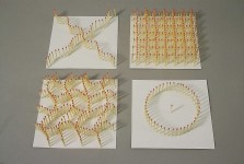 In several drawings I explore the mathematical equation, 8 + 2 = 10, mentioned in a recent interview with Hans Blix, referring to the number of nuclear states (8), and de facto nuclear states (2), which exist today as a result of the Cold War. Grommets and bolts are used both as support, and to count out this equation. In the series, �All Worlds�, ink drawings based loosely on maps and applied with matches are folded, rolled, or strung along metal bolts and locks, creating three-dimensional objects. These pieces allude to both a global sense of interconnectedness, and to the worldwide system of nuclear arms that is �locked in place�. The work grew out of a description of a match game described by Vladimir Nabokov in Speak Memory, one of the many visual devices he uses to come to terms with loss and exile. Though the work has a violent aspect � the potential for destruction by fire, the need for an explosion of meaning in a culture that has lost its bearings - it is not rooted in destruction or entropy. The tension in the work, as in life, is in the potential for upheaval, and the possibility of change. The formal appeal of the work contradicts the element of danger, suggesting the integral nature of impermanence.