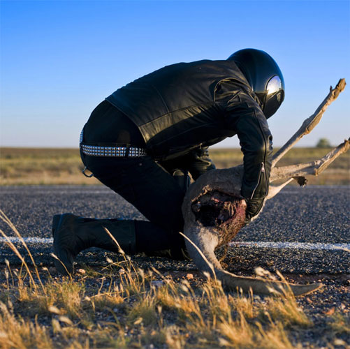 The Australian hinterland and desert regions are the fields in which obscure activities take place. The activities are highly charged: roadkill kangaroos are found on the side of highways by a black leather clad motorcyclist and given a ritualistic burial, a figure surfs a vehicle as it moves through desert roads, an individual rapidly paints and subsequently erases images of the/a universe in open arid settings, and a group of figures spin against natural rock formations.