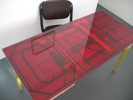 | TOM ELLIS, MOT, London, June 22 - July 21 2007 Tom Ellis invites us to take a walk up Klever Strasse where the architect appears to be a lazy drunken clown, with abandoned paintings, slacker expletives and a Berlin beer table. Even the Gallery has had its name inverted to become the artist. But then we are given glimpses of sharp wit and skilled craftsmanship when we realise that the artist has also designed the office furniture, a resplendent red glass table that spells out the word GONER, a prediction perhaps for the gallerist or curator that sits behind it? | ||||