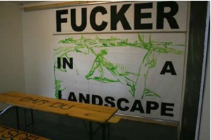 Images from top: FUCK IT Tom Ellis, 2007 Oil and Acrylic on Canvas 2500H x 2000W JACTAR VND KULTUR Tom Ellis, 2006 Oil and Acrylic on found white board GONER Tom Ellis, 2006 Glass, paint wood Fucker in a Landscape Tom Ellis, 2007 Oil & Acrylic on canvas | But before you can slap yourself knowingly on the back, we�re back to dumb with a hastily painted self-portrait on a scrappy piece of sheet timber, which itself has been attached to sliding door mechanisms allowing the work to literally travel across the wall like some collapsing clown car. As we enter the main space, what appears, at first, to be a bizarre grouping of pseudo-modernist paintings, soon turn out to be the slacker musings of Ellis as he mixes purposefully dumb sentence construction with deconstructions of Picasso and Goya. These are again on sliders that turn the oversized paintings into doors or give them the option of somewhere to go, but too little room to move. This sounds like a clumsy metaphor for the many dead ends of painting, but in Klever Strasse, dumb is Klever, and if you are in any doubt as to how to wear your hang ups, Ellis has installed a German Beer Tisch for the audience to sit and contemplate, Tr�s Pass�, Fucker in a Landscape, The Lazy Thieving Cunt and of course, Fuck It.