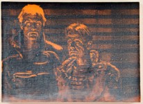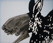 | In his paintings and drawings, Martinez captures the alienation of city life. Anger, loneliness, desire, rage, frustration haunt barren cityscapes in the form of totemic signs and symbols drawn from his urban environment. His images--drawn and painted with a skill rarely seen in contemporary art--are graffiti gang tags, ragged flaming Sacred Hearts, machine gun-toting fashionistas, demonic robot rabbits--the stuff of dead-end streets, abandoned warehouses, Botanicas, old comic books and magazines, faded tattoos and scarred skateboards. They are like a frame of double-exposed movie film, moments of absolute stillness and quiet, the city and its swirling chaos frozen for a moment, absolutely quiet, like the quiet of a coming storm. -Susanne Reece |