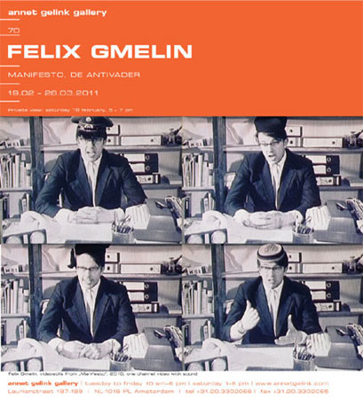 | ANNET GELINK GALLERY: FELIX GMELIN - MANIFESTO, DE ANTIVADER In the Bakery: Antonis Pittas - 19 Feb 2011 to 26 Mar 2011 Current Exhibition | ||||