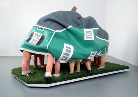 | BRIAN TOLLE Levittown February 5 - March 21, 2009 Opening reception: Thurs, Feb 5th, 6 - 8pm In his first show at CRG, Brian Tolle presents his latest body of work, Levittown. Levittown, a planned housing community in Long Island, New York, was designed and built by Abraham Levitt (Levitt & Sons) between 1947 and 1951 and became the archetype of American suburban life in the years following the Second World War. Tolle's sculptural works in this exhibition take their inspiration from that community. Tolle has created cast silicone versions of the original Levittown houses. Like the thousands that were mass produced and assembled on blighted farmland sixty years ago, each is structurally identical � literally made from the same mold varying only in color scheme. The rubber houses, without any means of internal support, resemble deflated or melting skins. Meticulously crafted and bearing all the architectural details of the original houses, the effigies occupy the gallery space in different forms, each draped over or suspended by different appropriated objects. In one of the works, the elastic house hangs languidly and contorted over a 1950's vintage beauty parlor hair dryer. The elastic shell takes on the figure-like structure of the form beneath it, resembling a cloaked and bowing figure. Other objects include a drinking fountain, a pair of crutches, and a foldout ironing board. Within each pairing, the found object and pliable architectural rendition inform each other; at times they exemplify hidden social or political signifiers that might remain dormant outside of their union. The structures that Tolle has chosen to use are objects from various periods and, like the original houses, represent quick and efficient mass production, the objects themselves characterizing a uniquely American brand of consumerism. The formal play that Tolle articulates between the colors, the shapes and textures of the objects that form the underlying supports maintain a freedom from a directly schematic or contrived disposition. A similar play engaged in by the inhabitants of Levittown through the modifying of their homes over the years has effectively erased the homogeneity that Levittown was both defined by and criticized for. Two defining cultural modes specific to American consumerism are presented in this exhibition: the seduction toward conformity or compliance with a mass-produced standard and the necessity to define one�s identity through the alteration or defiance of it. Brian Tolle is also recognized for this public commissions including the Irish Hunger Memorial located in Battery Park, New York City, and Stronghold at the University of Washington in Seattle, Washington. He was recently awarded by the Design Commission of the City of New York with the Award for Excellence in Design for a new sculptural project to be installed at the entrance of the Manhattan Bridge, Brooklyn, New York, in 2009. CRG GALLERY 535 W 22ND ST, New York, NY 10011 T 121-229-2766 F 212-229-2788 www.crggallery.com Transportation: C and E trains to 8th Ave at 23rd St / M23 Bus to 10th Ave and 23rd St | ||||