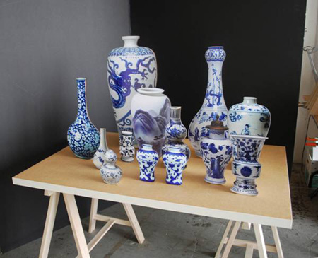 Stephanie Syjuco, Raiders: International Booty, Bountiful Harvest (Selection of 13 vessels from the A____ A__ M______), 2011 archival Epson photo prints mounted on lasercut wood, hardware, platforms | |||