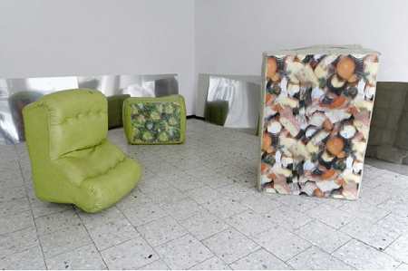 Andreas Diefenbach, demokratische architektur (wir bauen eine neue stadt), 2008 5 spiegelpolierte Edelstahlplatten, Sessel, verschiedene Materialien Gr��e variabel, Installationsansicht, upturn:Adready, 2008, Galerie Christian Nagel, K�ln | |||