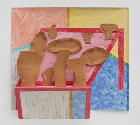 Betty Woodman, The Pink Table, 2014 glazed earthenware, epoxy resin, lacquer, acrylic paint, canvas, wood 65 x 60 x 12 inches (165.1 x 152.4 x 30.5 cm) | |||