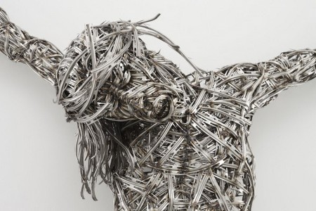 | ADEL ABDESSEMED Who's afraid of the big bad wolf February 17 - March 17, 2012 Opening reception: Friday, February 17, 6 - 8 PM David Zwirner is pleased to present an exhibition of new works by Adel Abdessemed. Spanning both of the gallery’s 525 and 533 West 19th Street spaces, Who’s afraid of the big bad wolf is Abdessemed’s second solo exhibition since he joined the gallery in 2008. Across a wide range of media, Abdessemed transforms well-known materials and imagery into charged artistic declarations. The artist pulls freely from myriad sources—personal, historical, social, and political—to create a visual language that is simultaneously rich and economical, sensitive and controversial, radical and mundane. The exhibition brings together recent works that revolve around the themes of war, violence, and spectatorship. The 525 gallery space will present works grouped by Abdessemed as primarily concerned with the dichotomy between meaning and matter: they include Décor, which presents four life-size sculptures of the crucified Jesus made entirely from razor wire. Modeled after German Renaissance painter Matthias Grünewald’s Crucifixion (a part of his Isenheim Altarpiece from 1506-1515), the contorted, twisted figures hang against an otherwise naked wall without the structure of the cross itself. Creating a formal juxtaposition between the hazardous qualities of the razor wire and its abstract appearance, Décor enhances the connotations of physical suffering implicit in the subject matter, while the repetitive appearance of the sculptures creates a distinctively decorative effect. Occupying the floor in front of Décor is a group of over thirty larger-than-life-sized microphones made from hand-blown glass. Perhaps an allegory for the ideal of transparent communication and open dialogue, the title of the work, L’avenir c’est aux fantômes (The future belongs to ghosts), is a reference to the late French philosopher Jacques Derrida, whose characterization of a variety of phenomena as “ghosts” was highlighted in Ken McMullen’s film Ghost Dance, 1983, featuring Derrida himself. Also on view nearby is La Grande Parade, a large installation of Abdessemed’s drawings of porcupines, weasels, tortoises, and other reptiles. Executed in the artist’s loose style, the animals have sticks of dynamite strapped to them as if presenting an allusion to modern-day kamikazes. In the 533 gallery space, which brings together works Abdessemed has characterized as primarily concerned with substantive themes of hope, death, memory, and compulsion, viewers first encounter Hope, an installation of a boat found abandoned on a beach in the Florida Keys. Used illegally to transport immigrants in pursuit of a new life to the United States, often compromising their safety in the process, the boat is presented as it was discovered, but has been filled to the brim with black bags cast in polyurethane resin from actual, stuffed garbage sacks. While a crude and provocative analogy between the trash and the boat’s former passengers appears explicit, Hope presents an art historical reference to Romantic artist Caspar David Friedrich’s apocalyptic painting from 1823-1824, The Wreck of the Hope, featuring a capsized vessel in a sea of icebergs. Also in the 533 gallery space will be Who’s afraid of the big bad wolf, a wall installation of taxidermy animals, including wolves, which takes its title from the famous soundtrack to Disney’s 1933 cartoon The Three Little Pigs as well as from Barnett Newman’s version of the phrase for his series of paintings from the late 1960s, Who’s Afraid of Red, Yellow, and Blue. Following on from Abdessemed’s previous work with preserved animals, the installation juxtaposes the age-old practice of taxidermy, used for scientific as well as for decorative purposes, with a reference to meaningless slaughter and war—the animals in the installation have subsequently been burnt and are a monotonous black while the overall dimensions correspond to Pablo Picasso’s Guernica, 1937, a now classic representation of the effects of war on civilians. Near the installation, Mémoire presents a video showing a baboon spelling out the words “Tutsis” and “Hutus” on a white wall, which refer to the names of the opposing ethnic groups involved in the 1994 Rwandan civil war and the ensuing devastating genocide. Coup de tête depicts the moment French footballer Zinedine Zidane headbutted Italian Marco Materazzi in the 2006 World Cup final in Germany in a heated response to a verbal insult by the latter. While it presents a realistic rendition of the event, Abdessemed’s slightly larger-than-life, resin sculpture is not so much a commemoration of the incident itself as it is a testament to the emotions and underlying narratives which often accompany major sports events. By distilling the moment of Zidane’s much scrutinized violent impulse, Abdessemed’s work draws attention to the verbal insults and provocations that often flourish in the sport without any visible manifestation, and further emphasizes the obsessive interest in drama that lies beyond the game itself. As such, it reverberates with the underlying theme of the exhibition, which is concerned with familiar manifestations of aggression and violence. Drawing on a multitude of seemingly converse and often visually spectacular references and symbols, Abdessemed highlights the interconnectedness of innate aspects of human behavior, while at the same time challenging passive modes of spectatorship. Born in Constantine, Algeria, Adel Abdessemed attended the École des Beaux-Arts d’Alger, Algiers, and the École nationale des Beaux-Arts de Lyon, France. He had his first American gallery exhibition, RIO, at David Zwirner in 2009. A major survey of the artist’s work is planned for October 2012 at the Centre Georges Pompidou in Paris, and will be accompanied by an exhibition catalogue. Abdessemed’s work was 