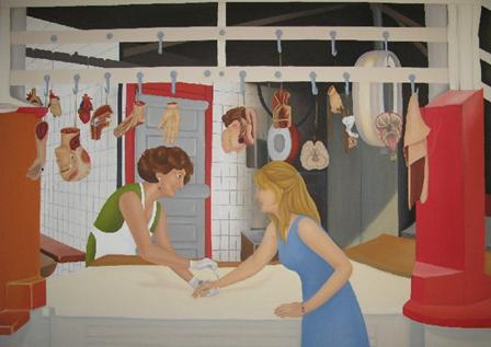 | ROSAL�A BANET Carnicer�a Love Carnicer�a Love is the title of ROSALIA BANET�s fourth exhibition at Espacio Minimo in which she continues to touch upon unpleasant themes such as pain and illness, always camouflaged under a false ingenuity. Carnicer�a Love is, according to the artist, the place where feelings are cooked. Although at a first glimpse the characters in the works seem to be preparing recipes using humans, in fact it is themselves that they slice, bake and saut�, their own hears that they rip out, and, in short, it is themselves that they cook. In actual fact, in most cultures there exists a relation between food and feelings, or more precisely between food and love. Mothers try to prepare the best foods for their children;guests are always offered the best recipes, the most succulent dishes; celebrations of any kinds always take place around the table� it is as if we projected part of ourselves on the food that we prepare. In the same way, the bodies used to prepare the recipes of Carnicer�a Love represent the exteriorization of the feeling of those who cook them. The intention of the cooks in the paintings, photographs, drawings and video that make up the show is not to harm the bodies; it is simply to show their pain, their suffering, their impotence� The beings that these women cook are the reflection of these feelings. Each recipe is, then, a look inside the person cooking, a way to purge the pain. Though these mutilated, sliced, baked bodies are outside their own they come from within. They are these women�s fears, the monster within that frightens them, and which they put on the table to confront. The monster is part of their own being, so the bodies that they cook are in some way a prolongation of their own. That is which the bodies have no identity, barely any physical features to define them , because thy are merely containers, molds filled with the cook�s entrails. Paintings � 3 large format works (Cocina para los amantes del arte, Cocina para los amantes de lo ajeno y Cocina para los amantes de Dios)-, drawings � the Recetas series-, photographs � the work that lend it�s title to the show: �Carnicer�a Love� - , video � Cake de V�sceras� �� and sculpture - the three disquieting models in the basement - make up the exhibition of trick-works of fake ingenuity that enclose a kind of deconstruction of feelings, a hard and disembodied look at that which is most sinister and painful within ourselves. ROSAL�A BANET (Madrid, 1972), graduated in Fine Art at Universidad de Vigo y t5aught painting at the department of Fine Art in Altea. She has held individual exhibitions in various Spanish and international galleries, and has partaken iun distinguish contemporary art fairs with Espacio M�nimo such as ARCO, FRIEZE ART FAIR in LONDON, CIGE in Beijing, SHcontemporary en Shanghai, ART CHICAGO, ART BASEL MIAMI BEACH or ARTSSIMA in Turin. | ||||