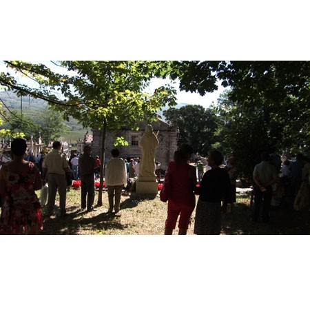 | Bridget Smith: We Must Live! 9 December 2011 – 11 February 2012 In this exhibition Bridget Smith explores the power of acting out an imagined scenario and the consequences it can have in real life. Her new film and photographs examine how a particular community deals with notions of life and death and how faith is used as a refuge in moments of crisis. Filmed in a small village in Galicia, Spain We Must Live! is set around the feast day of Saint Martha – who, her devotees believe, has the power to cure serious illness. Smith’s film follows the events of the day from the religious ceremonies to the evening festivities. On this day relatives of those who have survived a life threatening illness act out a symbolic death by lying in an open coffin. The coffin is carried in a procession through the village before its occupant emerges to picnic with their family. The day itself is one of extreme noise and chaos, but the film is a meditative work about our search to connect with something greater than ourselves. We Must Live! raises questions of how much a recovery from illness can be attributed to personal faith. Bursts of clashing noise and revelry are intercut with moments of reflection and remembering. The cast of real characters have all had experience of the power of Saint Martha: the young woman who has been in the coffin, the priest who represents the views of Rome, the man who has survived a life threatening illness and the local amateur dramatic group, ‘We Must Live!’ whose acting out represents a secular version of the devotions dedicated to St Martha. Also on show are a number of photographs including two from the shrine complex at Lourdes. These empty interiors where medical staff examine whether a ‘miraculous’ cure has occurred represent sites where scientific knowledge meets religious fervour. | ||||