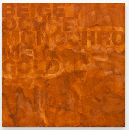 | Heimo Zobernig 21 January - 3 March, 2012 Two spaces for an exhibition, one expects for an intervention playing on both spaces simultaneously, even a re-duplication. Heimo Zobernig is usually keen on working on the question of the double: the double of the artist, the double of the space, or the double of the piece whether it is with mirrors, in the video Heimo Zobernig explains to his double how to make a performance , during the re-activation of a symposium, or even by showing his catalogues along with their references…This time at the Chantal Crousel Gallery, the doubling is not so evident. In appearance, one space, La Douane is dedicated to video works and sculptures, some dating from the 1980’s while a recent series of paintings is on display at the rue Charlot space. What could be said of paintings where words seem to surface from a haze? The paintings are made with adhesive letters placed on the canvas and covered by a layer of white paint. When the adhesive letters are removed, a light relief appears between the letters and the background and persists when other layers of paint are applied with a palette knife. Sometimes part of the background is painted directly in brown or blue onto the canvas, which allows for a darker effect. Depending on the configurations, the words then seem to emerge from or sink into a sort of haze. This produces a phantom-like effect in which the pure and minimal form is no longer the privilege of the language. Prior works of Zobernig’s, as in the “REAL” series, billboards “AMERIKANER”, “dCONSTRUCTIVISM” or the panel “SKULPTUR PROJEKTE MÜNSTER” address such issues. Yet the letters now appear in tonal withdrawal or in tonal advance, and form words succeeding one another, sometimes with repetitions or clippings. What could we think? Lists interrupted of artistic genres, as if Zobernig was trying to convince or remind himself what it is about (PAINTING/PAINTING/SCULPTURE)? Bizarre play on words (PAIN/TING/PAINTING)? A form of irony towards conceptual artists, guardians of the rules of language, in the way of Joseph Kosuth. (BEIGE/OCHRE/MONOCHRO/ME/GOLD)? Or associations that might make one smile (CONSTRUCTION/CHARM)? These are only speculations because “the text is not really on the visible surface,” says Zobernig. “These are paintings – colour and form – the words are like watermarks on the canvas. A phenomenon.” On some of these paintings appear one or more red lines, which interfere with the hazy backgrounds. Are these lines the contours of forms reminiscent of art history? “Sometimes I know, sometimes I don’t know,” explains Zobernig, referring in that regard to an artistic unconscious by way of the young Ruskin and his obsession with motives, as described by Rosalind Krauss. It is true that recently, rather surprisingly, Zobernig started introducing curved lines and dots in his series of paintings inspired by research on Piet Mondrian and Ian Burn, even though he hasn’t ceased exploring the questions left open by geometrical abstraction. The curved lines re-introduce here a subjective dimension into a field – geometric abstraction – that is focused on objectivity. “The free line is the subjective form but also the way to search for the good form. The grid stays objective,” Zobernig says. At the same time, the introduction of anthropomorphic figures in the videos and in the sculptures, also correspond to a form of subjectivity. For example, a video showing him engaged in a fight with vaguely human coloured shapes in chroma key colors – red, blue, and green – along with two sculptures from the series of “lamps – shelves – mannequins” are presented in the space of La Douane. The Lexikon der Kunst 1992 consisting of a glossary of lists of words composed with Ferdinand Schmatz, had provided Zobernig with a system, which allowed (in conjunction with the graphic designers from Experimental Jetset) for the creation of the posters and the cover for the catalogue of his exhibition at the CAPC in 2009. Much in the same way, the inventory of terms permits Zobernig to work the shape and the material of the words on the surface of the canvas. He thus joins a debate on the objectivization of poetry, undertaken by Mallarmé and Broodthaers, and that can be traced in the recent works of Josef Strau, Clément Rodzielski, Michael Krebber or Bernadette Corporation. Catherine Chevalier Heimo Zobernig Jan. 21, 2012 - March 3, 2012 Deux lieux pour une exposition. On attend là une intervention qui se joue sur les deux espaces à la fois, voire même un redoublement. Car Heimo Zobernig aime habituellement travailler sur la question du double : le double de l’artiste, le double de l’espace, ou le double de l’oeuvre – que ce soit avec des miroirs, dans la vidéo "Heimo Zobernig explique à son double comment on fait une performance", lors de la réactivation de symposium, ou encore en montrant ses catalogues et leurs références... Cette fois à la galerie Chantal Crousel, le redoublement n’a pas lieu de manière évidente. En apparence, un lieu est dédié à des sculptures dont certaines datent des années 1980 et à des vidéos, l’espace de la Douane et l’autre, la galerie de la rue Charlot, est réservé à une série de peintures récentes Que dire des peintures d’où semblent émerger des mots d’un épais brouillard ? Elles sont réalisées à l’aide de lettrages adhésifs placés sur la toile et recouverts d’une couche de peinture blanche. Lorsque les adhésifs sont enlevés apparaît ainsi un léger relief entre les lettres et le fond, qui persiste lorsqu’on ajoute d’autres couches de peinture à l’aide d’un couteau-palette. Parfois, une partie du fond est peinte directement en brun ou bleu sur la toile ce qui donne un effet plus foncé. Selon les configurations, les mots semblent alors émerger d’un brouillard ou s’y enfoncer. L’effet est phantomatique, la forme pure 