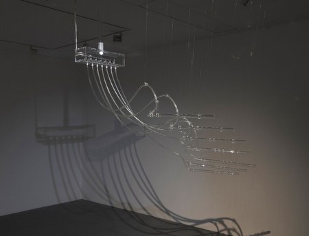 | Cerith Wyn Evans | Incarnation São Paulo Galeria Fortes Vilaça is pleased to present Incarnation São Paulo, a new exhibition by celebrated British artist Cerith Wyn Evans. In his second solo exhibition at the gallery, two sculptures of technological vein propose an intense sensorial experience in counterpoint with a third piece composed of plants in movement. A 30 minutes video complements the exhibition. Since the 1990s, Wyn Evans has been focusing his production on works that question the nature of written and visual language with clear-cut conceptual accuracy. His installations can be seen as repositories of meanings arising from different sources, reassembled as to reveal many discursive paths. An ongoing dialog with the works of great artists from past is established, with a direct reference or using their very works with a new approach revealing a wish to keep their ideas at play. His refined esthetics is nearly always influenced by a deep interest in the history of cinema and literature. Flute Piece Incarnation is a sculpture composed of five glass flutes designed by the artist. He has composed an abstract track made up of sounds mechanically delivered by a pipe organ compressor integrated into the sculpture. Permeating the space, the sounds contrast with the immateriality suggested by the object's transparency. Columns (Assemblage) IX is a sculpture that unfolds from the deconstruction of a perfect column of light, of minimalist inspiration, made with old fluorescent tubes. Like the sounds, the warmth radiated by the light has a strong physical presence in space. The third sculpture is made of three different plants placed on revolving platforms that move very slowly. The piece adds an organic, earthy element to the exhibition, by highlighting sculptural delicacy and elegance in an object of perennial nature. The video The sky is thin as paper here..., that has it's titled taken from a sentence by William Burroughs, also navigates the thin line between the immaterial and the physical worlds. This silent black and white projection casts a judicious selection of scenes from Japanese celebrations in which the human body is intensely present. Images of a range of night skies are superposed to those ritual scenes in a slow and hypnotic motion that gradually creates a subjective narrative. Cerith Wyn Evans was born in Wales, and currently lives and works in London. His participations in collective exhibitions include the Venice Biennial (1995, 2003, and 2009), Yokohama Triennale (2008), the Aichi Triennale (2010), the 9th Istambul International Biennial (2005), and the 11th Kassel Documenta (2002). His more recent individual exhibitions include the Bergen Kunsthall (2011), the Tramway, in Glasgow (2009), the Inverleith House, in Edinburgh (2009), the MUSAC, in León (2008), the ICA, in London (2006), the Musée d'Art Moderne de la Ville de Paris (2006), the Kunsthaus Graz (2005), the Museum of Fine Arts in Boston (2004), and the Frankfurter Kunstverein, [2004]. | ||||