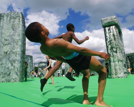 | Jeremy Deller 19 octobre - 24 novembre 2012 Vernissage le jeudi 18 octobre 2012 de 18:00 à 23:00 “Mon cher Ami, l’histoire n’y est pour rien. Elle ne possède pas d’immense fortune, elle ne mène pas de batailles ; c’est l’Homme, l’Homme lui seul qui fait cela, qui possède et se bat. L’histoire n’est pas une personne à part entière, utilisant l’Homme comme un moyen de mener à bien ses propres desseins, l’Histoire n’est rien d’autre que les actions faites par l’Homme afin d’atteindre son but”. (1) Pour sa troisième exposition à la galerie Art : Concept, Jeremy Deller nous entraîne dans une plongée en apnée à travers l’Histoire, nous amenant à réfléchir sur la place que nous occupons dans la société actuelle. Autodidacte et n’ayant pas fait d’école d’art, son travail revêt des apparences Pop, gaies et parfois cyniques. Au travers d’oeuvres comme A Time Before Shopping, une peinture murale représentant un trilithe de Stonehenge, ou les photographies de ces jeunes gymnastes réalisant des pirouettes sur le temple mégalithique devenu structure gonflable, il ne s’agit pas tant de commettre un Sacrilege (tel est le nom de cette pièce surprenante), que de réunir deux cultures séparées de plusieurs siècles en les faisant s’affronter par le jeu. Ce Stonehenge gonflable mais aussi le diaporama Beyond The White Walls présenté à l’occasion de cette exposition à la galerie, et dans lequel Deller relate plusieurs projets hors-les-murs réalisés notamment pendant les dix premières années de sa carrière, ou encore Memory Bucket, documentaire sur les us et coutumes texanes qui lui valut le Turner Prize en 2004; tous revêtent un caractère humoristique et critique et mettent en relation différentes communautés dans différents contextes. La grande force de ces oeuvres est qu’elles posent directement la question de la sacralité et de l’intouchabilité des espaces, des codes sociaux et des emblèmes de pouvoir et à fortiori des pouvoirs politiques, économiques et religieux. Qu’il s’agisse de fouler le sol sacré de Stonehenge en sautant dessus ou de mettre en exergue la culture populaire en évoquant les fans de musique ou le peuple britannique réuni à Buckingham le jour de l’annonce de la mort de la Princesse Diana, il s’agit avant tout de donner naissance à un pouvoir créatif de masse. Et plutôt que de craindre ou subir les pouvoirs en place, il en résulte une confrontation entre Histoire, culture et patrimoine. Le travail de Jeremy Deller est à expérimenter par tous et pour tous, il nous invite à créer une oeuvre participative où chacun à un rôle à jouer. Ses oeuvres, trans-historiques et partisanes de la libre expression comme vecteur de valeurs et de sens, initient un dialogue entre les cultures, les gens, le passé, le présent et ce que pourrait être le future. Dans une société qui prétend ouvrir l’accès à la culture et n’a de cesse de prodiguer un modèle à suivre, sur ce qui est culturellement et intellectuellement acceptable et ce qui ne l’est pas, Deller s’en détache et joue avec ces stéréotypes sociétaux en s’intéressant aux sous-cultures, au folklore, aux hommes. L’être humain dans ce qu’il a de plus profond, du clown marginal se perdant dans une exposition universelle en passant par le mineur en grève réagissant contre le tatchérisme ou encore les fans vivant leur vie par procuration, Deller collecte les objets et les images puis les assimile pour nous. Il en découle un panorama identitaire, une vision communautaire ou individuelle qui nous recentre finalement sur nous-mêmes. Cet artiste non conventionnel qui commença par exposer dans la propre maison de ses parents en 1993 et qui représentera le Royaume-Uni lors de la prochaine Biennale de Venise, n’a de cesse de fouiller, d’excaver et de nous plonger dans un univers fascinant et finalement inconnu: le nôtre. Aurélia Bourquard (1) Karl Marx & Friedrich Engels, La Sainte Famille ou la Critique de la critique critique contre Bruno Bauer et consorts, (1845), chap VI, version numérique, Jean-Marie Tremblay, p.100. - Jeremy Deller 19 octobre — 24 novembre 2012 Vernissage le jeudi 18 octobre 2012 de 18:00 à 23:00 My Dear Friend, history does nothing. It possesses no immense wealth, it wages no battles; it is Man, real living Man that does all that, that possesses and fights. History is not a person apart, using Man as means for its own particular aims; history is nothing but the activity of Man pursuing his aims’ For his third exhibition at Art : Concept, Jeremy Deller takes us for a dive in apnea through History with the aim of making us consider the place that we occupy in nowadays society. Self-taught and uncontaminated by art-school teachings, Deller in turn adopts Pop, funny and somtimes cynical styles. Through pieces such as A time Before Shopping, which is a wall-painting that represents a trilith of the Stonehenge, or through the pictures of young gymnasts doing flips in the megalithic temple which he has turned into a bouncy inflatable castle, the idea isn’t so much to commit Sacrilege (which is the title of this surprising piece) as to bring together two cultures separated by centuries and organize their playful confrontation. The inflatable Stonehenge, as well as the Beyond The White Walls slide show that will be presented during this exhibition, in which Deller relates different outdoor projects he made during his ten first years of career, or even Memory Bucket a documentary on customs and patterns in Texas, which was rewarded with the 2004 Turner Prize; all have a humorous and critical dimension and serve as contact element between different communities in various surprising contexts. However, the real strength of these pieces resides in their ability to pinpoint questions on sanctity and the prohibition to enter certain monuments or touch and manipulate certain emblems and s