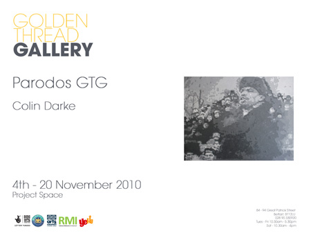 | Parodos GTG Colin Darke Opening 6pm � 8pm 4th � 20 November 2010 Project Space About the Exhibition Parodos GTG is the first showing of Colin Darke�s most recent series of paintings, Parodos, along with accompanying animations of its installation in the gallery space. The work, consisting of sixty paintings and two animations, reproduces a short film of the delivery of a speech by Russian revolutionary leader Vladimir Lenin. It refers implicitly to Sophocles� play Antigone and Lenin�s looped back-and-forth motion as he addresses his audience echoes the movement of the Greek chorus as it expresses the moral arguments of the drama. In formal terms, the piece also references the work of Bertolt Brecht, in which �Film in its own right can be used in the epic theatre as a kind of optical chorus.� About the Artist Colin Darke, originally from London, is based in Belfast. He studied at Goldsmiths College from 1977 to 1980 and is currently completing his PhD at the University of Ulster. He has shown widely, including solo shows in Dublin, Derry, London and Toronto. Group shows include Manifesta 3 (2000), Venice Biennale (2003), Busan Biennale (South Korea, 2004) and God and Goods (Villa Manin, Italy, 2008). About the Gallery From its beginnings, in 1998, in a former linen mill on a contested �peace line� in North Belfast, Golden Thread Gallery has delivered annual programmes of exhibitions and activities designed to make a real contribution to the visual arts and wider communities in Northern Ireland. Now located in Belfast�s developing �sailor-town� area, on the edge of the city centre, Golden Thread Gallery has grown a unique position in the region by simultaneously developing programs of contemporary art that reach local and international audiences. Golden Thread Gallery has no permanent collection. Providing instead an ongoing series of temporary exhibitions and activities, that provide accessible and thought provoking opportunities to engage with aspects of contemporary artistic practice. We pride ourselves on offering a friendly, open space where everyone is welcome. For those who have never visited the Golden Thread Gallery before, why not pay us a visit and get a taste for what we do. For further information about our program and projects visit our website www.goldenthreadgallery.co.uk or e-mail: [email protected], or why not join us on Facebook or Twitter, we love new friends. The Golden Thread Gallery is a company Limited by Guarantee NI 41642 and is accepted as a Charity by the Inland Revenue under reference XR 54731. Opening Hours: Tuesday - Friday 10.30am - 5.30 pm & Saturday - 10.30am - 4pm. Contact Details: 84-94 Great Patrick Street, Belfast, BT1 2LU. 0044 (0) 28 90330920 | ||||