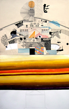 At the core of Shaun O�Dell�s drawings is the recognition that Americans have defined and recharged their sense of national self throughout history by inflicting violence on nature and its inhabitants. Composed of his personal iconography, Westward: The Corpse of Empire Takes its Way (2005) depicts O�Dell�s reflection on the Los Alamos National Laboratory, which was founded in New Mexico by Robert Oppenheimer during WWII in order to develop the first nuclear weapons.