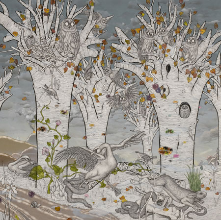 Jon Rappleye�s drawings present the viewer with a variety of creatures inhabiting very unnatural terrains. Chalk white landscapes are populated by almost barren trees. Animals, birds and sea creatures are grouped together densely, as water rises or rushes by. Volcanoes erupt and snowcapped mountains are framed by multicolored skies.