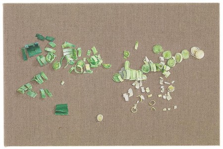 In her exquisite paintings on raw linen, such as Chopped Leek (2011), Helene Appel focuses her minimalist version of trompe l’oeil on often overlooked common objects, elevating the ordinary to the extraordinary. In a recent essay on Appel, Anna-Catharina Gebbers states: “Her subjects have already been accessories to the performances of the everyday; the chopping of onions, the sweeping up of crumbs. Now, placed on the canvas, the things can act to reveal themselves.” In Appel’s work, it is the careful, painstaking process of crafting the fiction of the object which reveals the intricacies and depth of dimension contained within the object itself. Kaz Oshiro and Alison Elizabeth Taylor also employ the ideas and methods of trompe l’oeil in innovative ways. In her recent body of work, Taylor makes paradoxical use of fine materials to carefully reproduce vignettes from the disintegrating foreclosed homes found in her home state of Nevada. The marquetry floor piece she created for this exhibition, Armstrong Congoleum (2011), suggests the illusion of layers of vinyl flooring peeling back in disrepair yet is in fact meticulously composed entirely of wood veneer. Similarly, Oshiro’s Untitled Painting, Upholstery (black / diamond with vertical trim, black and silver duct tape) (2011) might first present itself as a vintage car seat cushion, complete with an improvised repaired edge after years of use. Yet upon closer inspection, the object subverts the viewer’s expectations with the discovery that it is in fact a painting. As Christina Valentine has observed of Oshiro’s work, “The idea of the doppelganger, a ghostly double that haunts the physical object, serves as an easy metaphor to define the semiotic theft and switching of signs.”