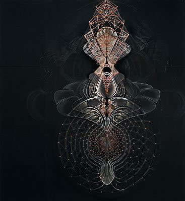 While it would be simple to intimidate or lose viewers with such grandiose and all inclusive concepts that inspire the artist such as theoretical physics or string theory, Amy Myers works with the notion of intimacy on many different levels in mind. It is the intimacy of the viewing that allows the mind to wander while tracing through the intricate mix of calculated linear and fluid organic forms. The large scale drawings can envelop the viewer's line of sight and create a space to step into. The use of the paper itself is not only a showcase for the artist�s technical virtuosity with the medium, but is as well loaded with intimate notions. Myers incorporates her body as a tool when drawing, her hands touching the paper hundreds, thousands of times during its creation, her body close to it as she completes the minute details that make up her thought provoking formations. Throughout this entire process, it is the paper that is unforgiving of mistakes and never forgets. Every foregone idea and every touch is left in plain sight, relics of every experiment and changed mood, the paper is the record keeper as a scientist holds data of every move.