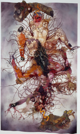 Wangechi Mutu, I belong to you, you belong to me, 2007 Ink, paint, mixed media, plant material and plastic pearls on Mylar, 92 x 53 inches Courtesy the artist and Victoria Miro Gallery