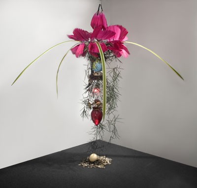 | "Where the Wild Things Are"... is no place at all and all places that cannot be lived in but visited, realized out of our careful, playful and tenacious tourism of others, realized as our mobility wanders too far. Rina Banerjee's work explores specific colonial moments that reinvent place and identity as complex diasporic experiences, their aesthetic and cultural beginnings suggest in particular how the many regional culture affects continue to stain our perceptions of home, the exotic, the foreign and domestic worlds. Her system of assemblage' of colonial objects, souveniers and decorative crafts make the experience of seeing artifact and history in art making as an entangled process which reconfigure our boundaries and those trespasses that occur with increased mobility. The global place is garden made out of travel both real and imagined and illusionary world. She began her education/profession as a material science engineer hence the artwork has a sense of material awareness often mixing the organic and plastic to invite a blurring of our recognition. She creates sculptures, installations, videos and drawings inspired by a wide range of mundane objects, home crafts, and her imagery stem from multiple cultural histories both eastern and western art. Rina's characteristically mischievous process of transformation of objects and their cultural locations playfully unhinges them from their unique specificity. The result has been both a fragmented object that offered a new way of seeing the culture. Her use of narrative text which decorate the work with meaning and intention further playing with the idea of artist voice and the aesthetic of exotic beauty physical illusion of ornamental object as sign. Rina Banerjee was born in 1963, Calcutta, India. Educated at Yale University, School of Art 1995 and currently lives and works in New York City. She has exhibited internationally including solo exhibitions in New York City, with upcoming exhibitions Berlin(2007), Paris(2006) . She has shown in such prominent group exhibitions as Tsumari � Echigo's 3rd Triennial , Japan(2006), The Greater New York Show, PS1 MOMA(2005), Massachusetes Museum of Contemporary Art, North Adams (2004), Whitney Museum of American Art's Atliera Space(2003).The Whitney Biennial (2000) at the Whitney Museum of American Art. | ||||