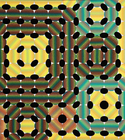 Geoffrey Todd Smith relentlessly (and patiently) seeks to discover beauty in his abstract painting/drawing hybrids amid the ceaseless interruptions and distractions of daily life. Using a limited vocabulary, he delineates a seemingly impenetrable field of optical buzz and hiss. Beginning with a grid of painted dots, he adorns his color fields in a "horror vaccui" fizz of zigzags while directing the viewer through densely hand-drawn patterns and painted elements that optically mix and integrate colors. In each of Smith's works, small painted dots and ellipses become embedded in the structure of a grid or interfere with it, depending on absorption or reflection of light, while also reinforcing the rhythm and direction of the zigzags.