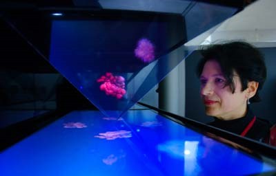 | PLEASE SCROLL DOWN FOR THE ENGLISH VERSION Art Laboratory Berlin wünscht Ihnen/ Euch allen ein gutes, glückliches und gesundes Neues Jahr 2015! Im Neuen Jahr werden wir die Ausstellungs- und Veranstaltungsreihe zum Thema [macro]biologies & [micro]biologies fortsetzen und möchten Sie/ Euch auf unsere Events im Januar 2015 hinweisen, die Teil des Vorspiel-Programms 2015 der transmediale und CTM sind: Sonntag, 11. Januar 2015, 15-18 Uhr: Science-Café mit dem Berliner iGEM-Team Das Berliner iGEM-Team (http://igem.berlin/) wird sein Projekt "Remote-controlled E. coli bacteria/ Magnetic Bacteria" vorstellen, das sie 2014 während des Finales des international genetically engineered machines competition am Massachusetts Institute of Technology (MIT) in Boston präsentiert hatten. Art Laboratory Berlin und iGem Berlin möchten Sie einladen, Ideen, Projekte und Auswirkungen aktueller Tendenzen im Feld der Lebenswissenschaften in einer offenen Runde zu diskutieren. 23. Januar 2015, 19 Uhr: Vernissage der Ausstellung [micro]biologies II: πρωτεο / proteo mit aktuellen Arbeiten von Joanna Hoffmann Ausstellungsdauer: 24. Januar – 29. März 2015 Öffnungszeiten: Fr-So, 14-18 Uhr (und nach Vereinbarung) zusätzl. 29.1.2015, 14-18 Uhr, sowie 30.1., 27.2., 27.3.2015, 14-21 Uhr Kuratorengespräch: 1. März 2015, 15Uhr Künstleringespräch: 29. März 2015, 15Uhr Kuratoren: Regine Rapp & Christian de Lutz [micro]biologies II: πρωτεο / proteo mit Arbeiten der renomierten polnischen Künstlerin Joanna Hoffmann ist die vierte und letzte Ausstellung der Reihe [macro]biologies & [micro]biologies bei Art Laboratory Berlin. Das Ausstellungsprojekt untersucht kleinste Biomoleküle, welche die Grundlage für Leben darstellen. Joanna Hoffmanns interdisziplinäre Arbeiten verbinden Kunst, Mikrobiologie, Physik und Technologie. Durch die Verwendung von Multimedia-Installationen, 3D-Stereoskopien, experimentelle Videoanimation und andere Medien untersucht sie die Visualisierung subatomarer, molekularer sowie kosmischer Räume. Ihre Arbeiten beziehen sich auf aktuelle Forschungsergebnisse über das Phänomen Leben und die Wechselbeziehung zwischen dem Naturwissenschaftlichen und dem Kulturellen, dem Sinnlichen und dem Trügerischen, dem Digitalen und dem Biologischen, dem Natürlichen und dem Synthetischen. Die Ausstellung versteht sich als Labor der Imagination und verbindet einige Stränge der künstlerischen Forschung von Hoffmanns Langzeitprojekt "Hidden Topologies of Being", inspiriert durch die atomischen Strukturen von Proteinmolekülen (bekannt unter dem Begriff "basic bricks of life"). Ihre komplexen geometrischen Strukturen wiederum vergleicht man mit Calabi-Yau Räumen, in denen sich entsprechend der Superstringtheorie aufeinander folgende Dimensionen unserer Welt auf subatomarer Stufe winden (kräuseln). "Wenn die naturwissenschaftliche Hypothese über die multidimensionale Natur der Welt stimmt" so Joanna Hoffmann, "dann befinden sich diese verborgenen Räume überall, an jedem Punkt des Räumlichen - außerhalb sowie innerhalb von uns selbst. Was bedeutet es für uns, in einem multidimensionalen Universum, oder gar Multiversum zu leben? Was für Mittel haben wir, um das Unsichtbare zu verstehen?" Der Ausstellungsraum bei Art Laboratory Berlin wird in eine Multimedia-Installation verwandelt. Im Zentrum steht die Arbeit πρωτεο / Proteo, deren Titel sich auf die griechische Wurzel des Wortes "Protein" bezieht (griech. πρωτεῖος grundlegend, vorrangig). πρωτεο / Proteo ist eine Animation, in der Partikel ein Mini-Universum in der Form der Calabi-Yau-Räume bilden. Man kann die Entstehung gewundener Proteinmoleküle und ihren dynamischen molekularen "Lebenstanz" beobachten. Gleich einer poetischen Antwort visualisiert sich hier die Frage über die Beziehungen zwischen Energie, Materie und Form. Die Animation wirkt wie ein Hologramm innerhalb einer transparenten Pyramide, wie eine Art virtueller Inkubator, in welchem sich der Prozess weiterentwickelt und wiederholt. Durch die Verwendung unterschiedlichster Technologien wie beispielsweise "Pepper's ghost" (ein Vorläufer der Holografie) stellt Joanna Hoffmann den Rezipienten vielfältige Strukturen naturwissenschaftlicher, philosophischer und ästhetischer Analysen vor. Durch die Verbindung naturwissenschaftlicher Daten, Bild, Ton und Poesie thematisiert sie in ihrer Arbeit πρωτεο / Proteo mögliche Herausforderungen und Grenzen der menschlichen Kognition und schafft eine emotionale Brücke zwischen unserer alltäglichen Erfahrung und der Abstraktheit der gegenwärtigen Naturwissenschaft. Für diese Ausstellung arbeitet Joanna Hoffmann mit dem Soundkünstler und Komponisten Andre Bartetzki zusammen. 30. Januar 2015, 20 Uhr: Eröffnung des [macro]biologies & [micro]biologies Bibliothek Parallel zur Ausstellung [micro]biologies II: proteo präsentieren wir die [macro]biologies & [micro]biologies Bibliothek, in der man Sekundärliteratur und Dokumentationen zu allen vier Ausstellungen und deren Künstlerinnen und Künstler studieren kann. Regine Rapp, Christian de Lutz Prinzenallee 34, 13359 Berlin www.artlaboratory-berlin.org [email protected] ************************************ Art Laboratory Berlin wishes you a happy, healthy and prosperous New Year! In January 2015 we will continue with the series of exhibitions and events on the theme of [macro]biologies & [micro]biologies and would like to draw your attention to our events as part of the 2015 Vorspiel programme of the transmediale and CTM: Sunday 11 January, 2015 3-6PM: Science Café with the Berlin iGEM team The iGEM Berlin team (http://igem.berlin/) will recap their project "Remote-controlled E. coli bacteria/ Magnetic Bacteria", which they presented during the finals of the 2014 international genetically engineered machines competition (iGEM) at Massachusetts Institute of Technology (MIT) in Boston. Art Laboratory Berlin and iGem Berlin invite you to discuss idea
