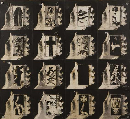 | Wallace Berman Verifax Collages Commissaire / Curated by Sophie Dannenm�ller Publication d'un catalogue / Catalogue available Vernissage le samedi 10 janvier de 17h � 21h Opening on Saturday January 10th, 5-9pm Exposition jusqu'au 10 mars 2009 du mardi au samedi de 11h � 19h Exhibition runs through March 10th, 2009 Tuesday-Saturday, 11am-7pm A legendary figure of the California Beat movement, Wallace Berman is generally remembered as unassuming, mystical and exceptionally charismatic. According to Dennis Hopper, "he affected and influenced everybody seriously involved in the arts in Los Angeles in the 50's. If there was a guru, he was it � the high priest, the holy man, the rabbi." Walters Hopps recalled "his magical touch of wit" � a magical touch still operating on younger generations who discover Berman's work today. For the first solo exhibition of the artist ever organized in France, the Galerie Frank Elbaz presents a selection of grids and "shuffles" from his pioneering copy art works, the Verifax Collages. Berman started using the Verifax photocopier around 1964. It remained his main artistic tool until his accidental death in 1976. Given his fascination for the power of words, the name "Verifax", meaning something like "True Facts", must have held a symbolic significance. It recalls for instance the titles of earlier works, Factum Fidei (1957) and Veritas Panel (1952-57), featured at the Ferus Gallery in 1957 � a legendary show closed by the police on grounds of pornography. With the Verifax, Berman was able to fuse several mediums that had long interested him, i.e. photography, collage and printing. The two-step gelatin dye transfer process of the Verifax is very similar to that of photography, although entirely automated. The original to be copied was placed on the Verifax glass plate and photographed; a negative image of the original was produced and needed to be re-introduced in the machine, before being discarded, to allow the final positive copy to be printed. In the Verifax Collages, Berman made extensive use of an image of a hand holding a transistor radio, taken from an advertisement for a small 1963 Sony transistor, probably found by chance in a magazine. Berman covered the text of the ad with white paint, retaining only the image, and then cut out the rectangular space of the speaker to replace it with various other images, found in the press or in books. The artist worked directly on the Verifax plate, without creating an actual pasted down composition beforehand. In other word, there is no "original" collage in the ordinary sense: the photocopy of the ephemeral piece is the original work of art. Berman experimented with the process, varying the required dosage of activator baths, as well as the development and exposure times. He also incorporated the negatives into finished works instead of disposing of them. Furthermore, the printed photocopies were usually not simply left in the form they came out: chemicals applied on the still wet paper produced degrees of highlights, shades of sepia, as well as spots and splashes that look like accidents. As a result, exactly identical "copies" of any one "original" were never obtained. After completing a series of single photocopies, actual collages were composed by gluing down on a board from 4 to 56 different "hands", side by side in a square grid pattern or overlapping in a "shuffle". This is in fact the only time a real collage takes place, with visible joints between the fragments � this of course doesn't happen with photocopying, which neutralizes all of the colors, paper qualities, layers and junctions. The so-called Verifax Collages (like today's digital art) are hardly collages in the sense of cutting and pasting materials to a surface, but rather disparate visual elements blended by a quasi-magical operation. The visuals resulting from the automated process, fortuitous incidents and controlled hands-on manipulations were many times removed from the images placed in the Verifax at the beginning of this creative routine, in which artist, chance, and machine alternately took the upper hand. Sophie Dannenm�ller | ||||