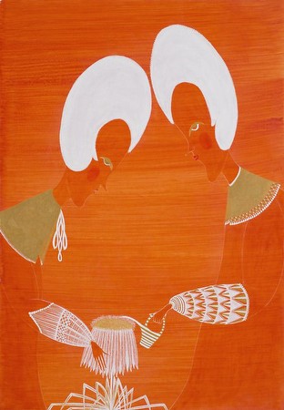 The Polish-born Jurczak’s macabre and fantastical works combine influences from folklore and mythology, along with inventions of her own imagination. The figures in her work are predominantly indebted to Eastern European iconography and exist in darkly whimsical dream-worlds, surrounded by anthropomorphic animals, creeping woods, hair, and all manner of deformed creatures. Jurczak’s highly stylized works are like fragments of an ongoing surreal narrative that starts and stops without needing to make any sense.